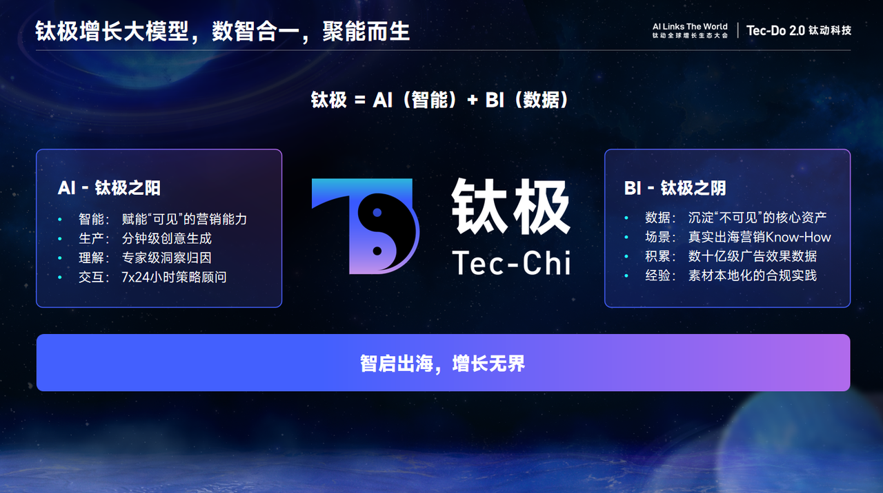 基于成立8年以来的海量数据与行业知识,钛动科技构建了AI与BI双轮驱动的技术体系。“钛极”大模型作为核心引擎,基于钛动科技服务超10万出海企业的深厚积累,构建了覆盖全球200多个国家和地区市场的动态知识图谱,在营销理解、创意生成和策略推理等专业领域展现出显著优势。